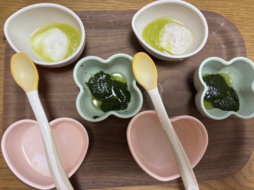 【2週目・1日目】10倍がゆ 小さじ6・ほうれんそう 小さじ2・(キャベツ 小さじ1)+(鯛 小さじ2)