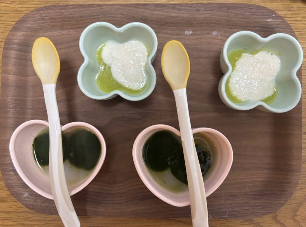 【2週目・5日目】(10倍がゆ 小さじ6)+青のり+キャベツ 小さじ1・(さつまいも 小さじ2)+(絹ごし豆腐 小さじ2)